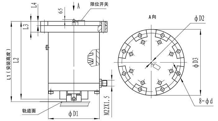 型號 | 額定頂軌力(KN) | 額定靜摩擦阻力(KN) | 油缸工作壓力(MPa) | 開(kāi)閘油量(L) | 有效行程 | 安裝高度L1 | L2 | L3 | L4 | D1 | D2 | D3 | d | 重量(kg) |
